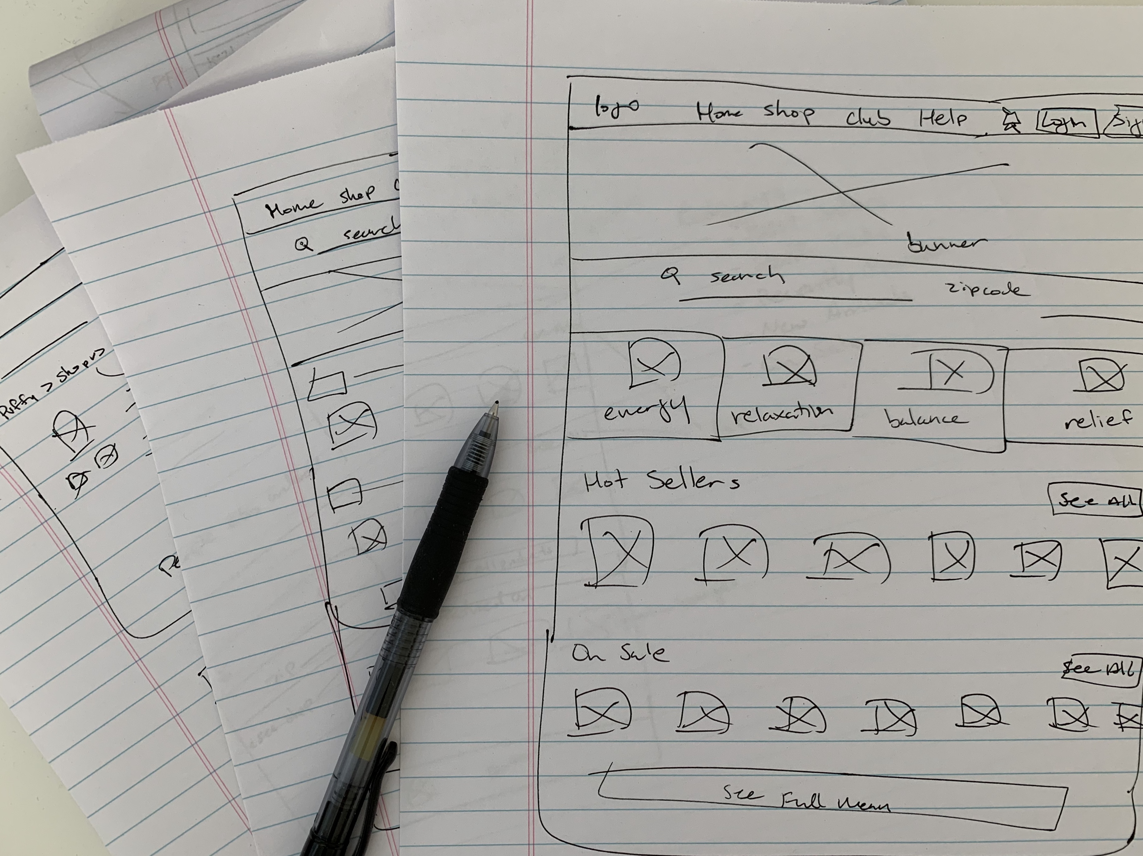 Image A (see image below): There were 3 different lo-fi wireframes being created with different designs. One of the wireframes had 4 different categories: energy, relaxtion, balance, and relief. Since our users had trouble figuring out which product best suits them, we created 4 categories that would "guide" the customers into knowing what is a suitable product for them. In the cannabis industry, people normally use terms such as "Indica, Sativa, Hybrid, or CBA", but for first-timers, they may not know what those terms mean. So, we used every day terms that people would understand, such as "Engery, Relaxation, Balance, and Relief".